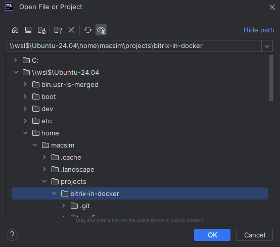 git clone https://gitlab.com/bitrix-in-docker/bitrix-in-docker.git - Сейчас вы можете открыть клонированный проект в вашей IDE, осмотреться и перейти из терминала в консоль IDE для выполнения следующих шагов по установке.